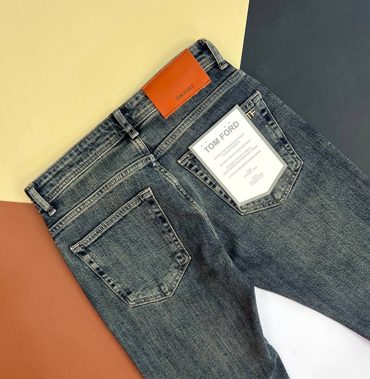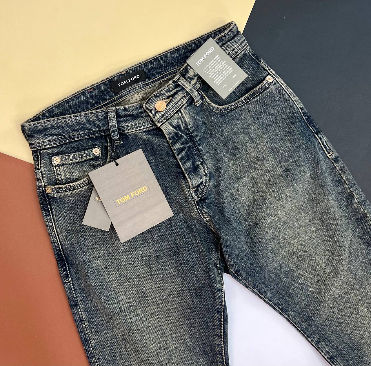 شلوار جین مردانه TOM FORD مدل راسته، با رنگ آبی کلاسیک سنگشور و هالههای طلایی/کرم، انتخابی شیک و متفاوت برای آقایان خوشاستایل است.