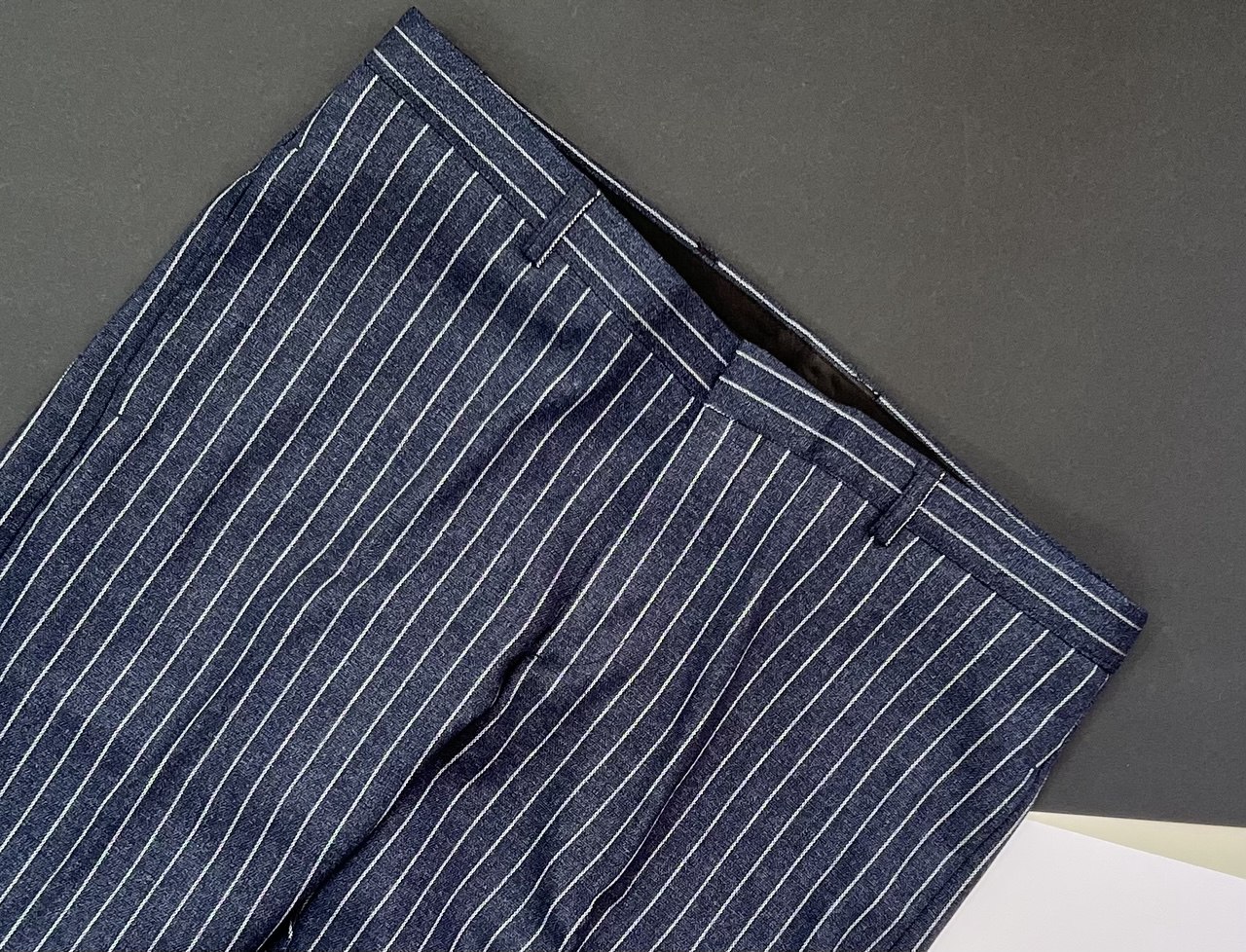 شلوار مردانه اسکینی فاستونی راهراه آبی نفتی، نسخهای مدرنتر از شلوارهای رسمی کلاسیک است.